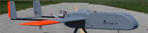 The Vector P features include a 103" wingspan, twin tailboom pusher design, redundant control surfaces, traditional composite construction, and tricycle landing gear configuration. The Vector P has a payload bay that measures 27' X 9" X 9" and can carry 25 pounds of payload/fuel for a maximum take-off weight (MTOW) of 75 lbs. Endurance is payload dependant with flight times from 1 to 6 hours, maximum fuel load is 3 gallons/20 pounds. Cruise speed is 58-65 knots, dash speed is 90 to 100 knots, maximum altitude is 10,000 feet MSL. Manual control is performed through an "off the shelf" JR9303 or Spektrum DX7 radio control system tansmitting on 2.4 GHz. Range for the 2.4 GHz is over 5000 feet line of sight. For communications spread spectrum modems Microhard 910A operating on 902 - 928 MHz. Using high gain antennas Max range is 60 miles. Demonstrated range is 5 miles with standard antenna. Main power to the aircraft is supplied through a central power buss (featuring redundant swithces and short circuit protection) with up to three 18.5 volt 6400 MAH Lithium Polymer Batteries. Power for the avionics, ignition and navigation lighting is sourced from the power buss. In addition power can be supplied to the payload. Maximum allowable power draw by the payload is 6A for one hour when equipped with two 18.5 volt 6400 mah batteries. Navagation is provided via GPS, airspeed and altitude by pitot-static. Control of autopilot once in "Auto" mode and telemetry are provided via a laptop computer. The Vector P can also be equipped and flown with the Cloud Cap Piccolo autopilot system.