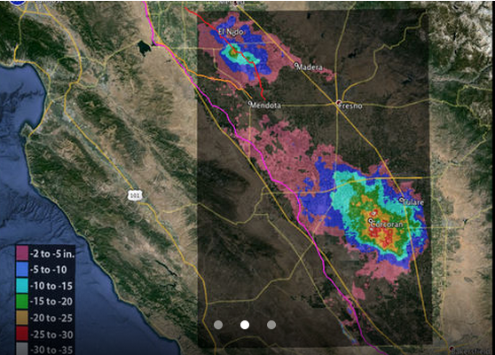 The California Department of Water Resources today released a new NASA report showing land in the San Joaquin Valley is sinking faster than ever before, nearly 2 inches (5 centimeters) per month in some locations.