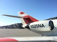 The tail of the new addition to the NASA airborne fleet. The HU-25 Falcon carrying the LVIS instrument.