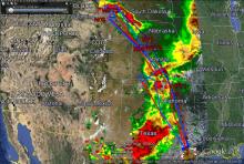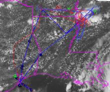 Figure1: Flight tracks (planned and flown) of ER-2 (blue) and DC-8 (red) for ER-2 science flight #6, August 23, 2013 overlaid on GOES visible image at ~20:30UT.