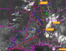 Figure1: Flight tracks (planned and flown) of ER-2 (blue) and DC-8 (red) for ER-2 science flight #8, August 30, 2013 overlaid on GOES visible image at ~20:30UT.