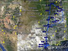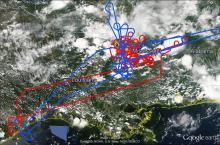 Figure1: Flight tracks (planned in dark blue and flown in light blue) of ER-2 for science flight #7, August 27, 2013 overlaid on MODIS-Aqua visible image at ~20:15UT.