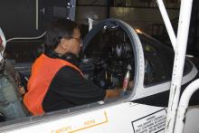 Electrician Sergio checks ER-2 cockpit avionics.