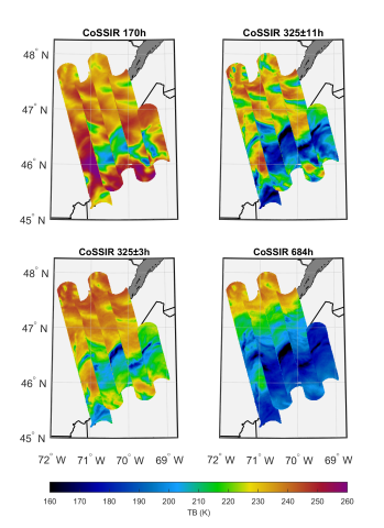 CoSSIR brightness temperature observations from an IMPACTS flight on February 17, 2023 over a rain/snow system over northern Maine and southern Quebec. Subject Data Instrument CoSSIR
