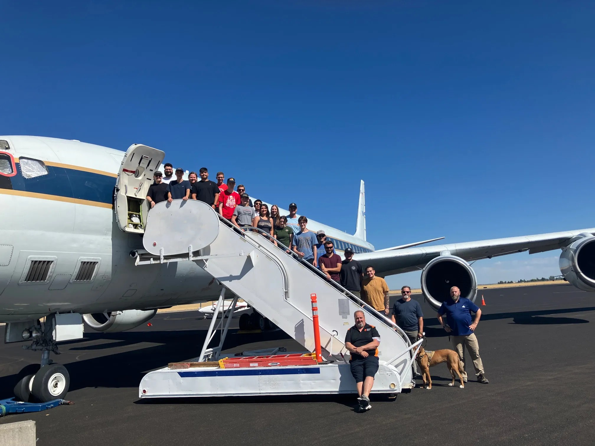 Idaho State University class of 2025 poses with their new hands-on learning tool, the DC-8 aircraft, after it was retired from NASA in May 2024 and arrived in Pocatello, Idaho. The university will use the aircraft to provide a hands-on learning experience for students in the university’s aircraft maintenance technology program.