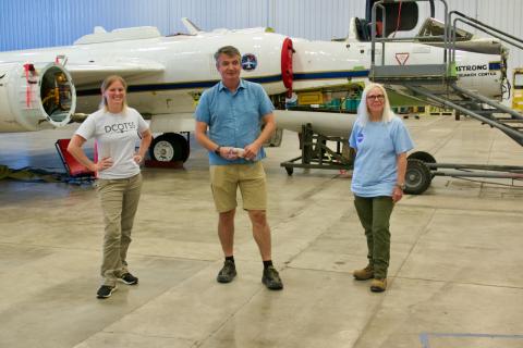 Caitlin Murphy (DPM), Dan Chirica (PM) and Judy Alfter (PC) are shown in hangar 606 with the ER-2 in the background.