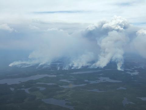 Fire behavior exhibited by fires N of Lake Athabasca, as observed by the NASA P3 at 1500h LDT on June 28, 2008. A typical developing convection column (smoke plume), about 4Km iheight is visible on the right side of the photo.