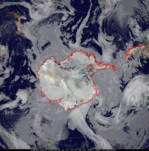 Infrared satellite composite image from the Antarctic Meteorological Research Center (AMRC) at the University of Wisconsin. The image shows dense cloud cover over the Bellingshausen Sea.