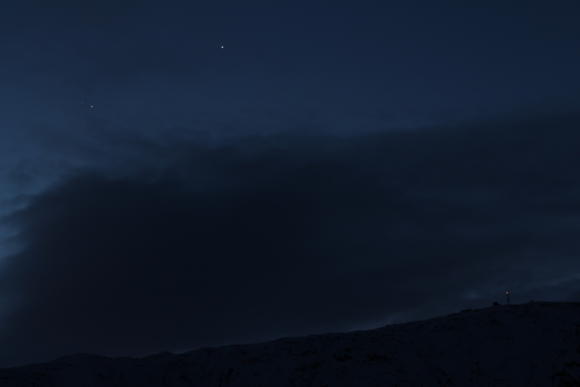The planets Jupiter (left) and Venus (top/left center) over Kangerlussuaq's landmark Raven's Cliff, before dawn this morning. The airport beacon is at bottom right. The aurora borealis was active in this part of the sky only minutes prior. We have witnessed aurora displays every clear night since we have been in Kangerlussuaq.