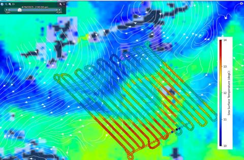 MASS sea surface temperature (SST) and DopplerScatt current lines on top of satellite SST data from yesterday. You can clearly see the cyclonic bullseye right in the middle (kudos to the pilots for letting science re-center lines late in the day to optimize the target).