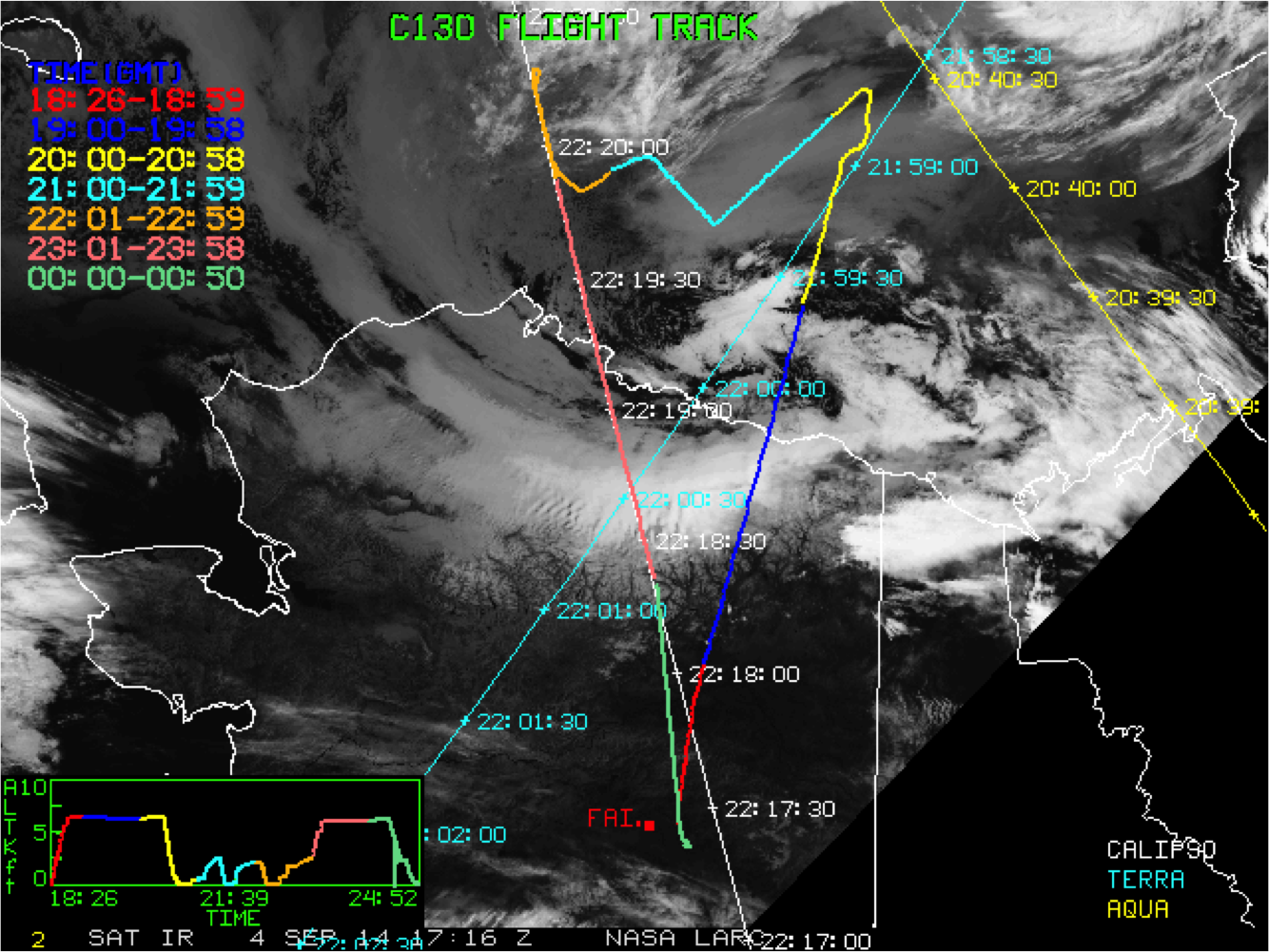 AVHRR infrared satellite image at 22:17 UTC on September 4, 2014, the C-130 flight track overlay with color coordinated altitude timeline and overpass tracks for several satellites (courtesy of Louis Nguyen, NASA LaRC).