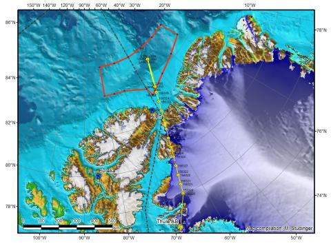 Today's P-3 trajectory over the Lincoln Sea in yellow. The red box marks the area that has been identified as suitable for today's experiment.Credit: NASA