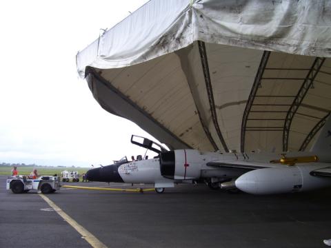 WB-57 being pushed into Clamshell Hangar