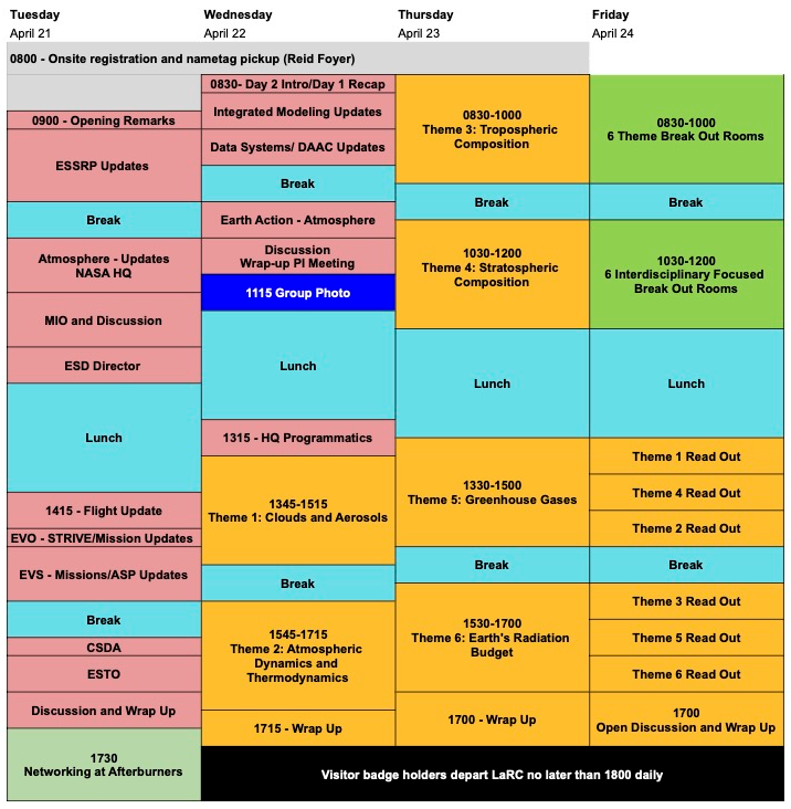 The goal for the first part of the meeting is an open discussion on the NASA research reorganization at NASA Headquarters (HQ), giving participants an opportunity to ask us questions to better understand what it may mean for them going forward, meet with all the new faces at NASA HQ in Atmosphere and other areas in Earth Science, and look for new opportunities to do forward-looking science.