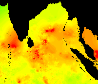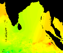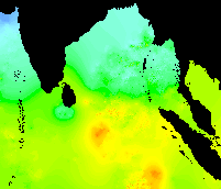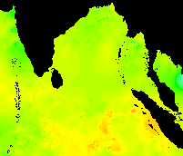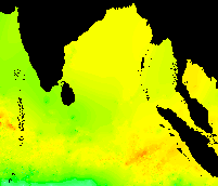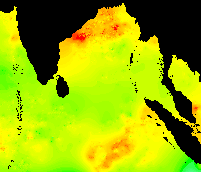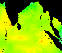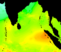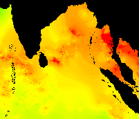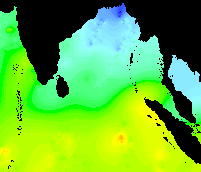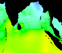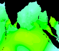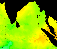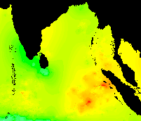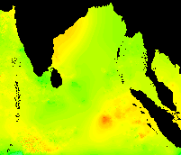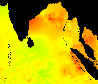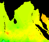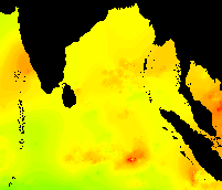 These data show the typical pattern for the Bay of Bengal: cold in the winter, warming up in the spring, hot in the early summer, warm in the mid-summer, hot again in the early fall, and cooling down late in the year.