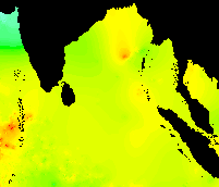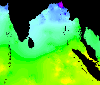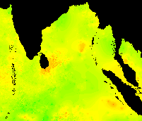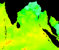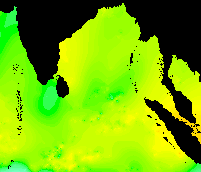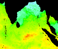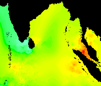 The following are bi-weekly subsets from weekly AVHRR Global Composite SST images from 1992. The color scheme is from lowest to highest temperature: purple - blue - cyan - green - yellow - orange - red. These images run from week one (1 Jan 1992) from top left across and down to the last week, week 53 (31 Dec 1992). The "strange" cold plume coming up from the bottom on week 35 could be due to an interpolation error, since these data are interpolated in the case of missing data, e.g., no raw data due to clouds.