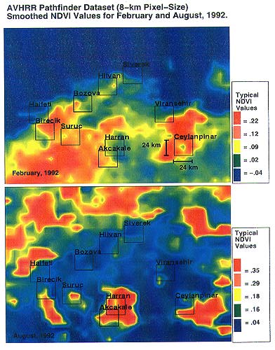Smoothed NDVI values from February (top) and August (bottom) 1992 derived