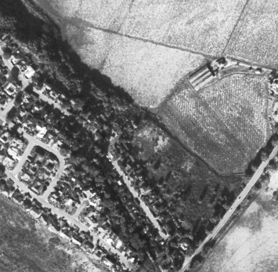 right, and rectangular house roofs in the lower left. The road in the lower right