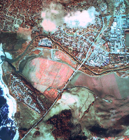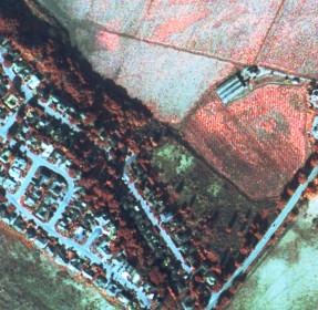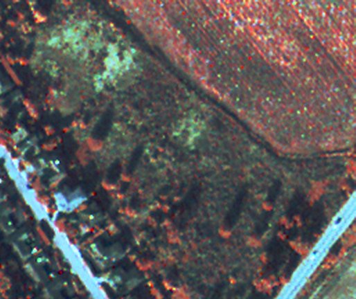 houses along the left edge is yellow: a terra-cotta roof in color-infrared.