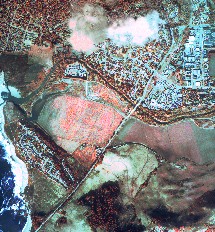 | In this 2x zoom of a 30-m Landsat TM image of the outskirts of Stockton, California, a few agricultural fields can be seen in various stages of canopy development and may be different crops as well, and fields that are probably bare are darker blue-green. The image is dominated by residential developments. The community in the lower right is mostly red, indicating it has established trees similar to the community in the upper left of the 10-m image to the right. The residential areas at the edge of town have only a hint of vegetation (red), so are probably new developments. | Resampled to 10-m resolution, this ARTIS image shows clouds in the upper middle and an urban or industrial region in the upper right. Residential road patterns can also be seen. Agricultural field patterns are difficult to see and the woods in the lower middle is a reddish-dark patch with some variation within it. |