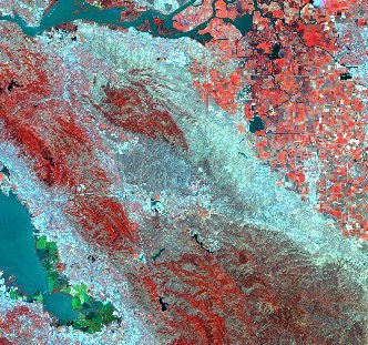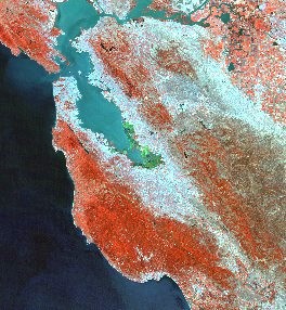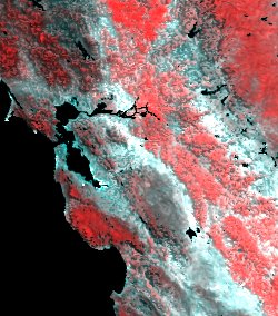 | Increasing the area further with 120-m resolution, the rivers can be seen to connect a number of lakes. At this scale the residential areas of Stockton are fairly uniform regions of color and the agricultural fields are smalls color chips. In the lower left are the valleys and grooves on bare slopes of the mountains. | At 250-m resolution the fields are blending together and only the larger mountain valleys can be easily seen. Roads and small rivers have also faded away. The cities of the East Bay are a cyan and red patches, while the Palo Alto-Atherton area has more tree canopy. Also visible is the San Francisco Bay, with its green-color salt evaporation ponds at the South end. |
