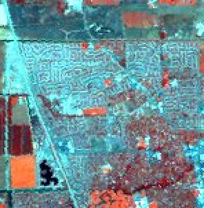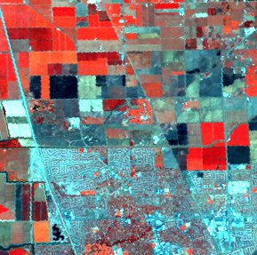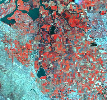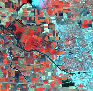 | At 30 m spatial resolution, a grid pattern of agricultural fields can be seen in various colors, from the bright red of fields with full canopy development, to copper and brass colored fields with little canopy, to dark blue-green of bare fields, and the very dark blue-green of wet or burned fields. The residential areas are a maze of twisting roads with various amounts of vegetative red. | In larger fields variations can still be seen at 60-m resolution, but residential areas are speckled with more or less dense vegetation. With the increased area, wavy, dark curves of rivers are visible. |